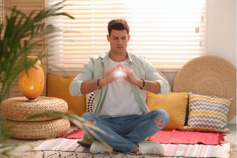 Find a comfortable position, either seated or lying down. Keep your spine aligned, creating an open channel for breath and awareness. Find a comfortable sitting position, eyes closed. Feeling a light beam shooting up into the universe. Breathe naturally, feeling the rise and fall of your stomach.